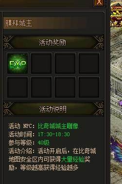 活动的时间在每天的11点半到12点半以及17点半到18点半两段时间里,等级达到40级的玩家即可参加。玩家在这段时间内回到比奇城城主雕像面前膜拜就可以获得海量经验,玩家自身等级越高,获得的经验值也就越丰富,而且玩家身处于安全区内,不必担心其他玩家的偷袭攻击,因此,想要升级的玩家千万别错过机会。