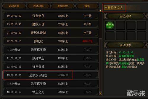 经验副本不能忘!经验副本在乐都《传奇霸业》中并不如封魔副本,但既然顶着经验副本的名号,其中可获得的经验同样不少,不过进入经验副本同样有讲究,乐都《传奇霸业》每天都有全服双倍经验时间,此时搭配多倍经验符进入经验副本,收获的经验不要太多!比较遗憾的是,封魔副本不享受多被经验符加成,比较可惜。全服双倍时间除了打经验副本,挂机也是不错的升级选择哟!