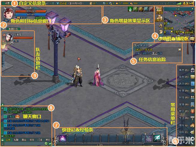 游戏主界面由自定义信息条、角色和目标信息窗口、角色增益效果显示区、小地图、任务信息追踪、等九大模块构成。如果对界面有疑问,请把鼠标移动到界面上查看相关信息。