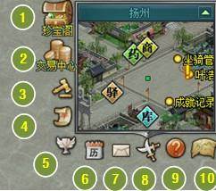 辅助功能区:小地图周围有一些常用的辅助功能按钮。按从左往右的顺序,依次为①珍宝阁、②交易中心、③拍卖行、④排行榜、⑤成就、⑥活动日历、⑦邮件、⑧自动战斗、⑨帮助、⑩地图。