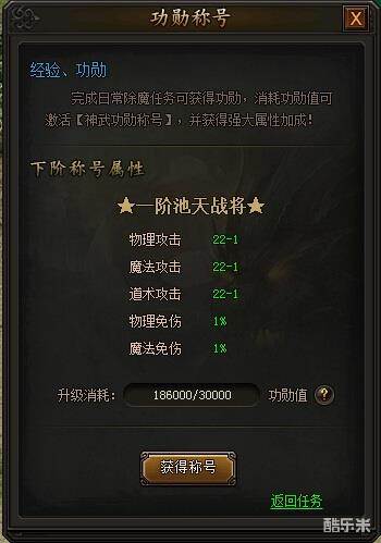 第一是完成除魔任务,可以获取大量的经验与功勋值,除魔任务每天可以完成12次,并且可以增加次数上限。刷到10星可以获得10000功勋,做完还可以领下三倍奖励。