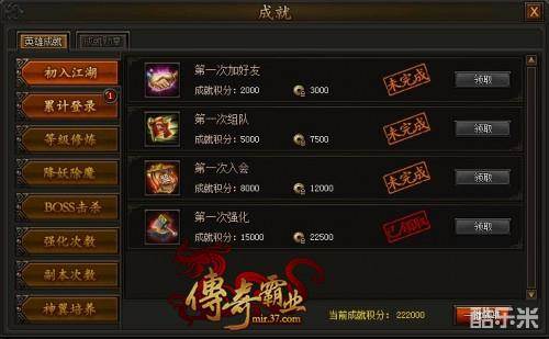 37《传奇霸业》成就系统五花八门,主要包括英雄成就和成就勋章,英雄成就中包括初入江湖、等级修炼、降妖除魔、BOSS击杀、神翼培养等等,初入江湖任务简单便捷,比如第一次加好友、第一次组队、第一次入会、第一次强化都可以获得成就积分;累计登录也不用玩家耗时太多,连续登录之后,玩家领取系统设置好的成就就可以了;再说等级修炼,从45级开始,玩家每提升5级就可以领取数值是很高的成就积分,一直可以领取到100级,可谓只需指头一点成就就来!