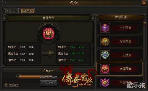 37《传奇霸业》成就勋章不仅是荣誉的体现,也能让你成就感枯竭的心灵得到安慰。累计足够的成就积分换取强大的成就勋章,这些勋章提供全属性的攻击,有着丰厚的属性加成,因此有了强力的勋章,打怪也就厉害很多。