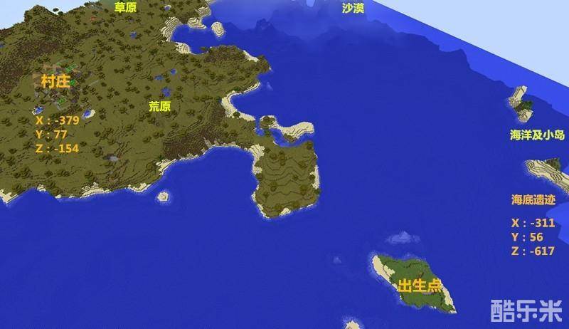 我的世界1.8.9海岛种子代码 村庄种子 海底遗迹种子,出生点在海上一个小岛上,周围有大小岛屿及大陆,离出生点不远处有村庄和海底遗迹,附近有草原,荒原,沙漠,海洋群系。