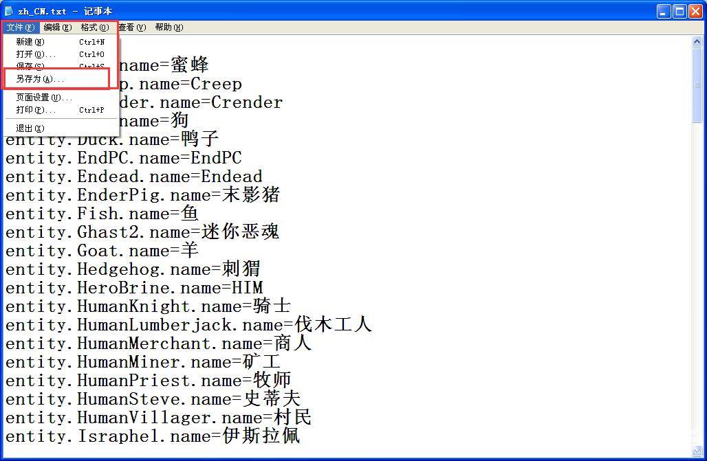 第六步(最重要的一步):汉化完后把zh_CN.txt文件的格式修改为UTF-8(这很重要,如果没修改将会在游戏里面出现乱码)并保存替换