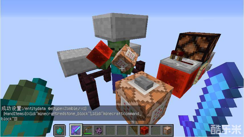 直接举个例子,我召唤一个僵尸后,需要僵尸右手持有红石块并且左手持有命令方块。