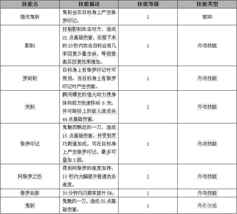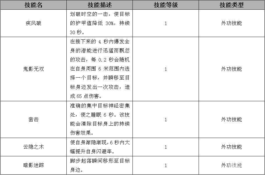 暗夜之主,刺杀之王。狡诈、灵动、凶狠,潜伏于阴影之中,跗骨之疽般贴近敌人却不被发现是他们的专长,他们追求的是在敌人最松懈的一刻,发动最致命的一击,一旦他们发动攻击,唯一的目的就是在最短的时间内致敌人于死地。但如果陷入缠斗,他们也同样可以借助鬼魅的身手、飘忽的身法以及多样的机关与敌游斗,最终解决对手,倏然而遁。