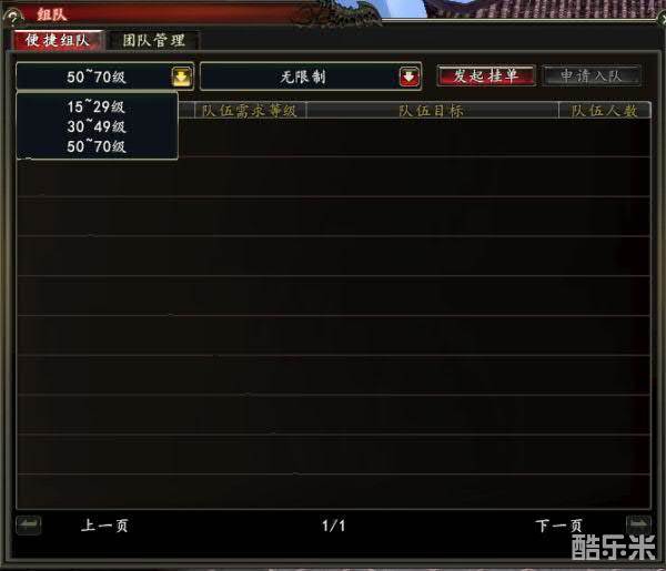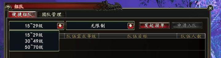 在便捷组队下方倒三角处可选择等级,三个等级段分别为:“15~29级”“30~49级”“50~70级,组队目的可以选择活动和副本。