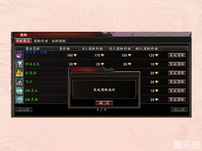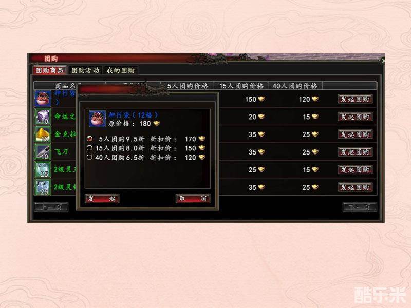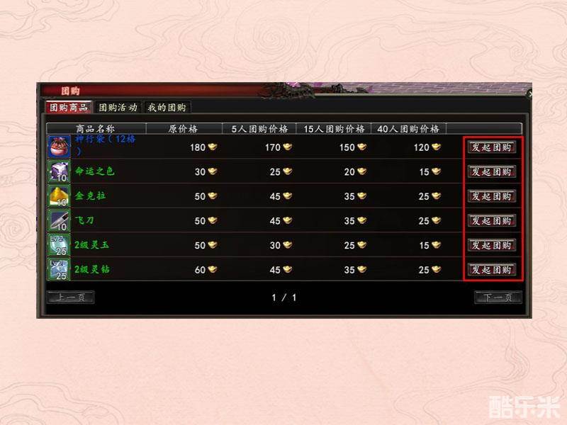 团购商品里展示了目前可团购的商品及商品的原价格和不同人数参与团购的折扣价格。玩家选择自己需要购买的东西,点击右边的发起团购。