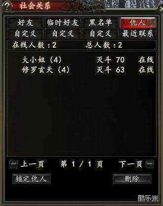 4.仇人:是自己杀过或者被杀过的玩家,当仇人上线或者下线时都会有相应提示。
