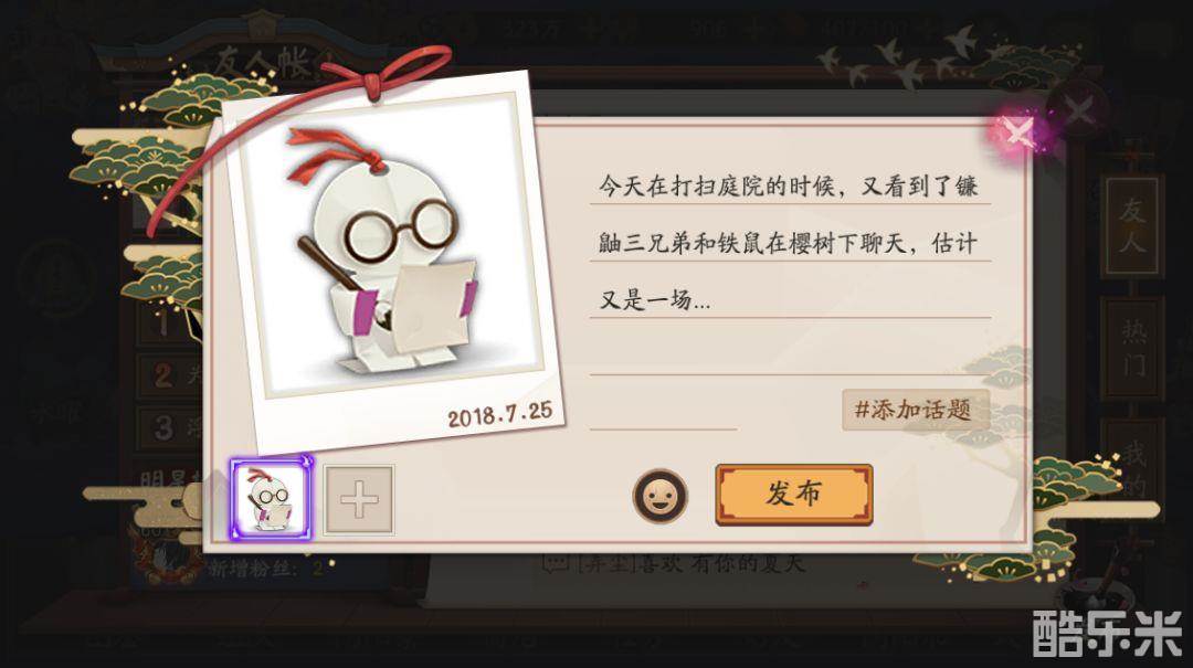 阴阳师们可以把平安京中发生的趣事,通过图片、文字、表情和添加话题的方式发布手帐,随时记录在”友人帐”中。