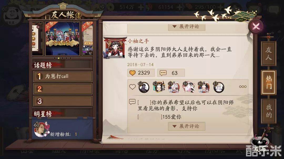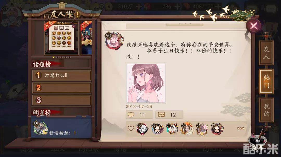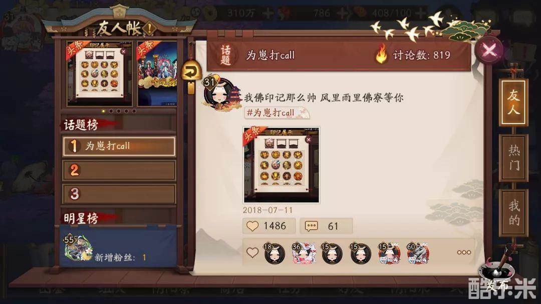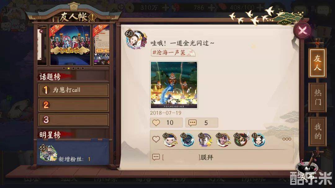 在每个整点,”友人帐”会更新头条、话题榜和明星榜~新增点赞与评论数最多的手帐将成为头条,并将会一直保留头条特殊标签。阴阳师们也可以在话题榜中查看当前最热门的讨论话题,点击后还可以看到该话题下的所有手帐内容并加入到讨论中。新增关注人数越多,阴阳师们越有可能上明星榜,成为平安京的明星!