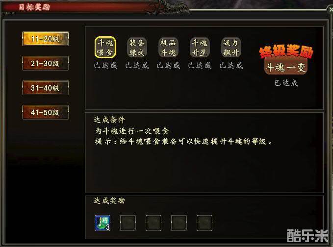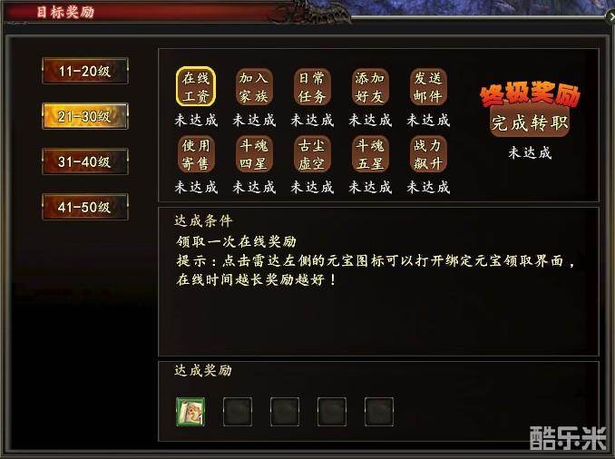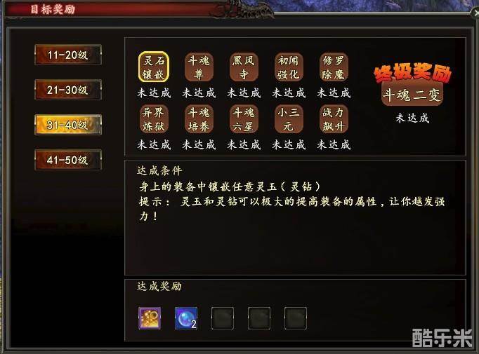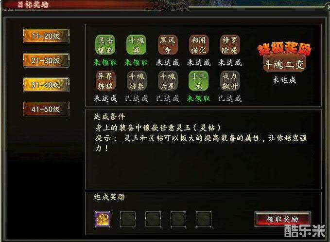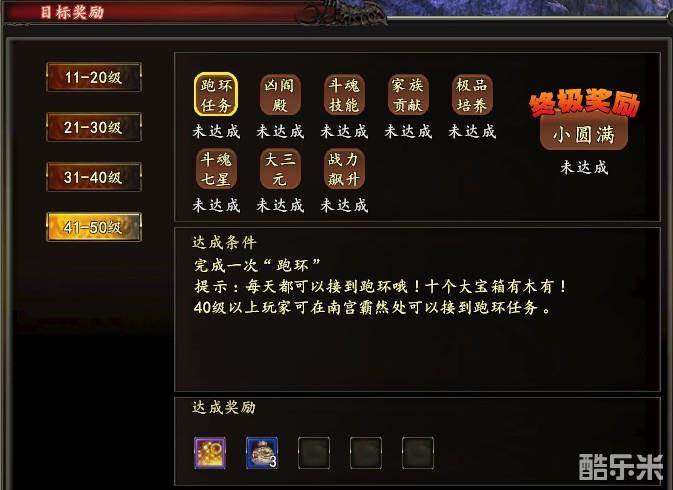 在游戏中,从11级开始,一直到50级,每10级会有普通目标奖励和终极目标奖励,完成目标会得到大量丰厚的奖励。