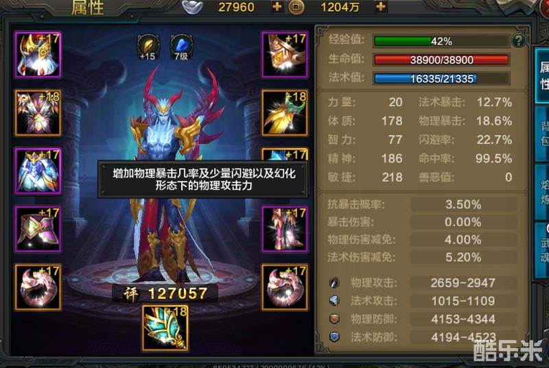 在装备上头盔的时候,物理攻击力在2659-2947之间,物理暴击率18.6%,闪避率22.7%。