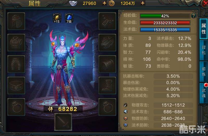 我们再将全身装备脱掉,这样基础面板的敏捷属性较低,看看敏捷增加的攻击力结果是否又有变化。在裸装的时候,面板敏捷属性是73点,物理攻击力是1512点,最大和最小物理攻击一样,物理暴击率12.9%,闪避率20.4%。