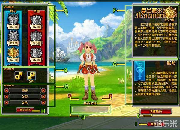 A:选择一个阵营及其下属的国家。如果公会或者几个朋友一起玩,请玩家们注意一定要选择同一个国家,玩家可在F和G处查看国家和阵营的介绍。