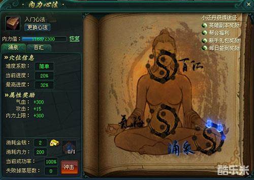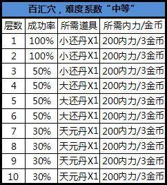 穴位冲击需要消耗金钱,内力值及所需道具,不同的穴位及不同的层数进度所需的道具也不同,冲击的层数越高失败概率也会越高;