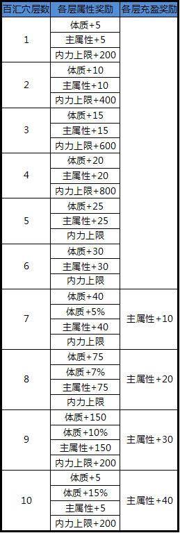 内力心法中一共有3条穴位,分别为:涌泉、百汇和气海;当角色等级达到20级后,第一条穴位“涌泉”开通;当角色等级达到35级后,第二条穴位“百汇”开通;