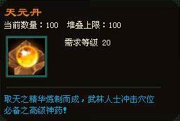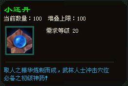 冲穴所需道具为“小还丹”、“大还丹”和“天元丹”,可通过礼包奖励、帮会福利、副本奖励、签到奖励及百宝箱购买获得;
