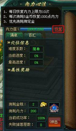 当内力值不足时可通过“恢复”按钮通过消耗金币恢复内力值,该功能每日有10次限制,每次消耗5金币恢复1000点内力值,优先消耗绑定金;