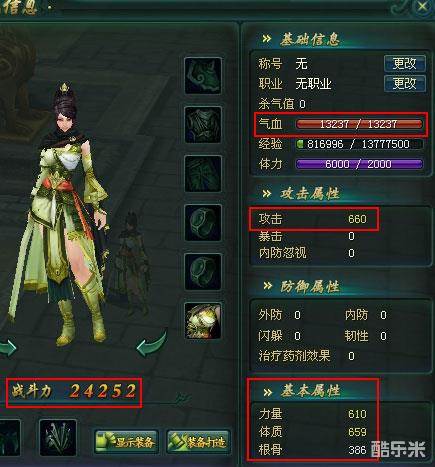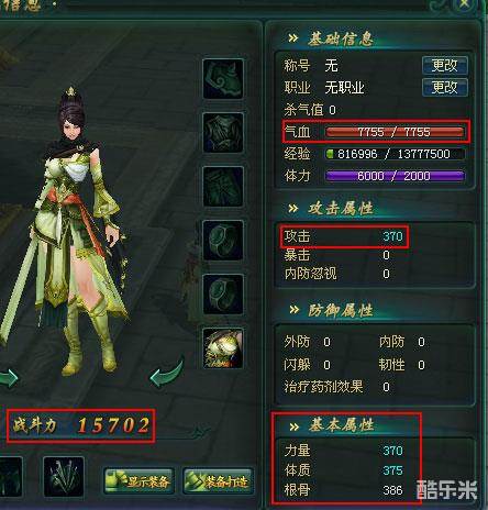 完成冲穴前的角色属性及战斗力: