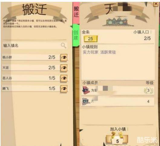 搬迁,可以一直点搬迁刷新小镇。点进去看看小镇的大概情况,还可以看到小镇的金条。房子会搬到新小镇,但金条带不走。