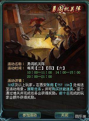 1.等级达到30级以上的玩家可在西安张庭处对话进入活动集合区;同时可通过组队平台中的活动列表接取相关任务,完成任务能获得大量奖励!