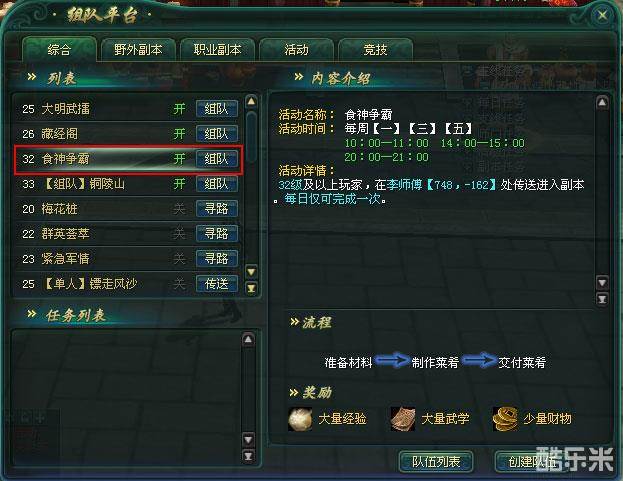 1.当活动开始时,32级及以上的玩家可组队前往西安城南大街(748,-162)处,在NPC“李师傅”处对话传送进入活动副本,或通过组队平台活动列表进行队伍匹配,然后进入活动副本。