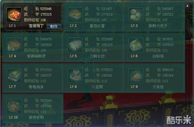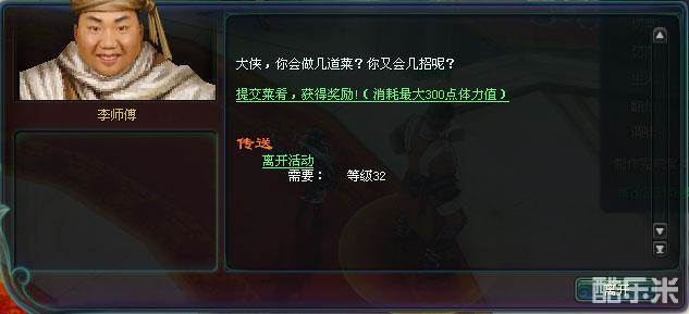 6.每次完成菜肴都能提升一定的厨师经验,玩家可通过NPC李大厨查看自己的厨师经验和厨师等级;厨师等级越高可制作更高级的菜肴从而获取更丰厚的奖励。