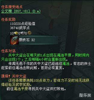 每日任务“通缉!关中大盗”,关中大盗会在渑池平原中刷新,被击杀后每隔4小时会重新刷新,玩家每天可通过公文榜接取任务后前往渑池平原击杀之,当关中大盗被击杀后会出现传闻提示;该任务每天只能完成1次,只有50级的玩家才可接取;任务奖励为经验、武学、流通金和原铁石X2。