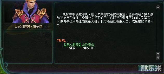 可通过NPC“西安四神捕•雷宇扬”对话进入,坐标【729 -236】;