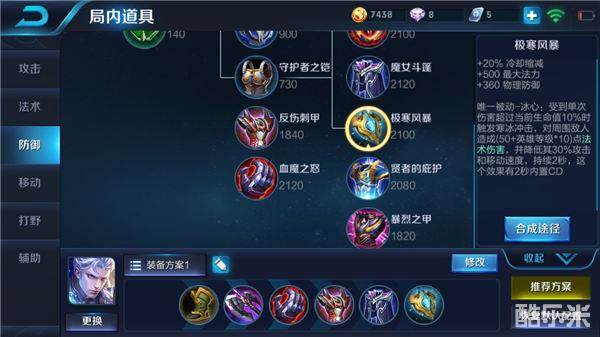 影忍之足增加了铠的移速和护甲,更有利于铠前期对线射手英雄,影忍之足的被动,能减少敌人的普攻伤害,增加铠前期的抗压能力。暗影战斧提供的属性都很适合铠,冷却缩减能加快一技能的冷却,让铠能打出更多次的技能消耗,普攻还有几率将敌人减速,增加了铠的留人能力。第三件出血魔之怒增加血量和攻击力,当血量低于30%时就会触发装备的被动,获得攻击力和巨额的护盾效果,让铠在和敌人对拼时,占有绝对的优势,同时也提高了铠的生存能力。第四件出反伤刺甲,这件装备大幅度的提升护甲值,装备还有反伤效果,这件装备可以说是射手和物理刺客的克星,当敌方的射手英雄或者刺客发育较好,那么反伤刺甲就要尽快做出,如果敌方的法师发育较好则优先出魔女斗篷。魔女斗篷主要提供了法术抗性和生命值的属性,用来对抗敌方的法师英雄。最后一件装备出极寒风暴,极寒风暴能降低周围敌军的攻速,并且极寒风暴收到伤害后会触发被动,对周围的敌人造成减速和伤害,根据对局出装,灵活运用。