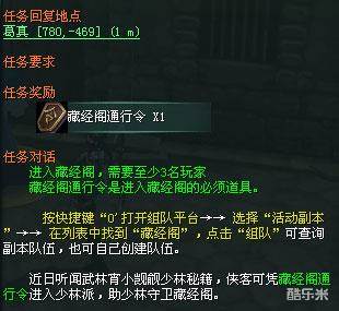 “藏经阁”,角色达到26级后可通过组队平台参与,至少需要3名玩家才可进入;每天可在西安NPC“葛淳”(742,-84)坐标及蓝田NPC“葛真”处(坐标780,-469)领取“藏经阁通行令”进入该副本;