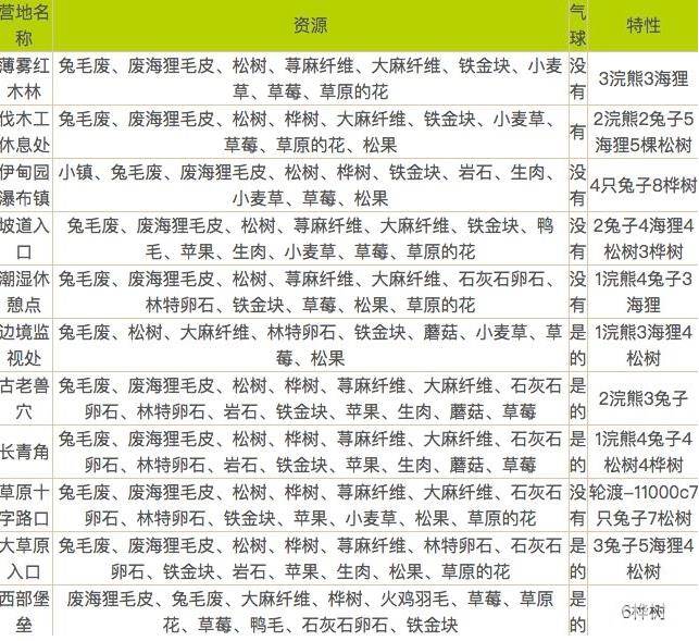 营地名称:薄雾红木林、伐木工休息处、伊甸园瀑布镇、坡道入口等