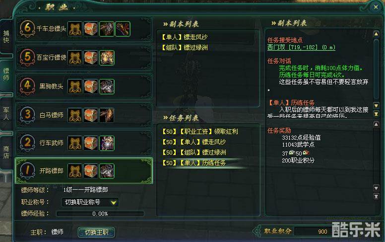 每天完成职业任务以及副本可以获得经验、武学、金钱、职业积分以及镖师经验。当职业经验达到满值时,职业等级会自动提升,每次提升都可以获得该职业等级段的奖励