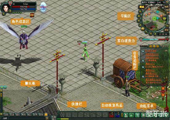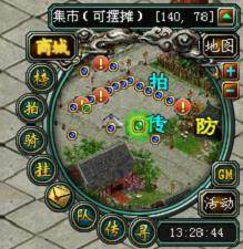 导航区显示玩家所在的地图,区域,在此可打开拍卖界面,大地图,查看排行榜、邮件信息,活动信息,NPC、BOSS、怪物信息,设置自动挂机,使用飞行旗设置传送点,该区域还有上下马的快捷键。