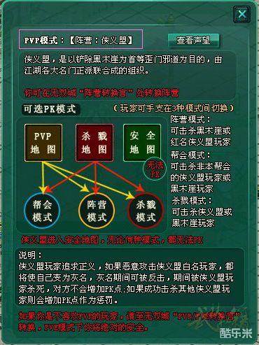 普通模式:侠义盟普通模式,只可以击杀敌对势力玩家。