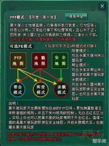 1、PK模式:武林秘笈在PK方面分为“PVP模式”和“安全模式”,“安全模式”绝对安全,无法参与PK。游戏中默认为PVP模式,即玩家创建角色后进入游戏即开启“PVP模式”。如果想转为安全为模式,可至无双城NPC“侠义使(安白互转)”,选择转为安全模式。
