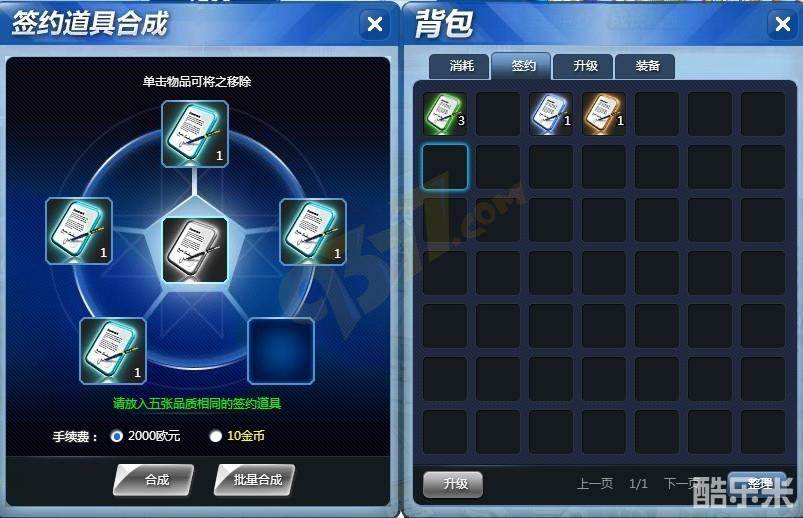 如上图所示,进入合同的合成界面之后,左边是放入道具栏,右边是选择道具框,点击右边你要进行合成的合成,在左边放入框就会自动放你刚才点击的合到里面。5张低级的合同可合成高一级的合同,这就是欧冠足球2合同合成的比例。