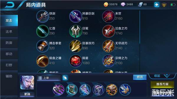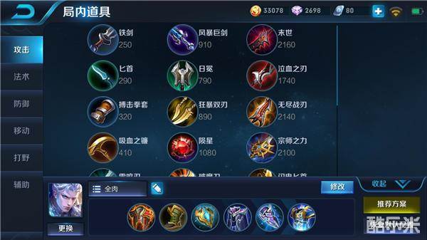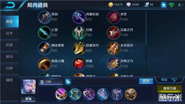 定位为战士的铠也可作为打野英雄,第一件装备可选择巡守利斧,提升打野效率,且获得的寒冰惩击可以用来减速敌人。中期可将巡守利斧换成巨人之握,后期关键团战中可将巨人之握换成贤者的庇护。其余装备和上单半肉装备基本相同。