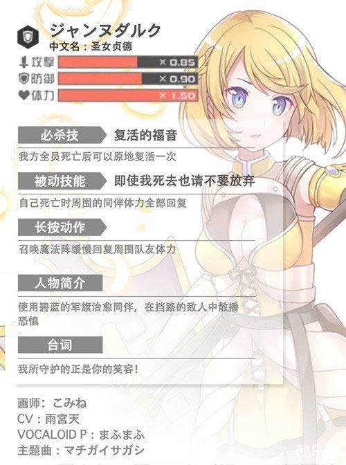 圣女贞德的故事大家都不陌生,在历史的舞台上,贞德通过自己的坚韧与出色的领导能力,带领法国军队对抗英军的入侵,并被法国人民视为民族英雄,这与她在#COMPASS中的设定不谋而合。在#COMPASS世界中的贞德是一个挥舞着苍蓝旗帜的支援型英雄,守护着自己的友方。自身的高生存属性与辅助能力,有她守护据点会让防守方非常得力!