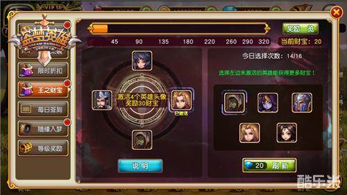梦境有王,王有财宝,王已不知归处,财宝等待着归属。王之财宝没有机关更无守卫,仙豆、进化石、洗练石遍布宝库,恭候玩家的到来。跨越时空而来的英雄纷呈而至,带领玩家进入宝藏,探索未知的神秘宝库。我们可以选择任何英雄来领取积分,获取不同品阶的财宝。高积分将拉近与最终财宝的距离,选择未激活的英雄将赢得更多的积分,从而将愈发丰厚的奖励纳入囊中。