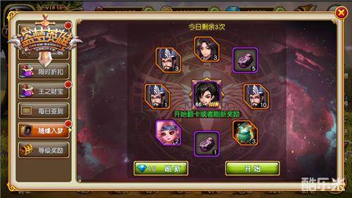 梦境之中,缘分无处不在,随缘如梦玩法便借此为玩家准备了诸多宝物。我们可以选择一个传说英雄进行随缘,每次随机出现英雄的缘分卡牌碎片、缘分装备碎片、钻石、进化石、洗练石等物品。一旦确定,随缘物品将进行洗牌,我们每次点击物品格即可获得对应物品。如不满意随缘英雄,可以重新选择,仅仅消耗剩余次数。我们同样可以刷新本次出现的随缘物品,让物品更合心意,然而刷新价格每次递增,需要慎重考虑。
