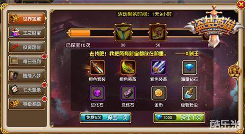 去吧!我把所有的一切都放在那里了!随着一声令下,玩家们开始寻找世界宝藏的历程。在这个活动中,每次探宝会随机获得各种物品,当探宝到一定次数后,可以获得额外的奖励,更有机会在排行榜上占据一席之地,获得丰厚排名奖励。除了能得到丰富的进化石与经验粉尘等稀缺资源之外,会有概率得到橙色套装和橙色装备!