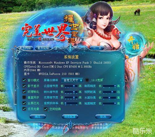 4、游戏更新完毕请您先选择系统设置,游戏会根据您的机器配置推荐给您一个已经设定好的系统设置,不过您也可以根据自己的需要进行调节。