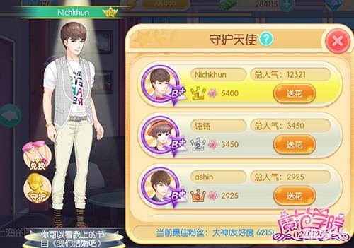 向明星赠送在花房中收货的花朵,可获得与该明星的友好度和名望奖励,不同的花朵获得的名望和友好度不同。明星的总人气为送花给该明星的所有玩家的友好度总和,每周总人气排名前五的明星,会给支持他的粉丝发礼物哦~根据排名不同奖励也会不同。另外,在总人气前五的明星中,友好度排名第一的玩家,在下一周的时间里,可获得这位明星成为其“守护天使”,让明星陪伴身旁。其他玩家也会获得应援礼包,包含不同数量的“明星应援瓶”,用来兑换男明星的时装。