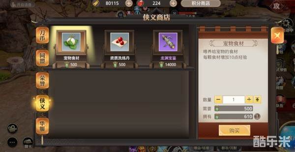 侠义值可在侠义商店中兑换宠物食材、资质洗炼丹以及龙渊宝鉴等道具。特别注意:侠义商店是设置在积分商店之内的哦!