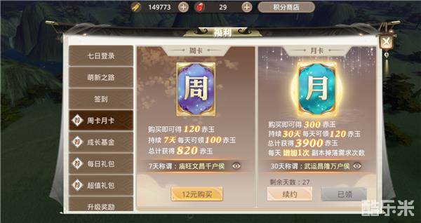 虽然每一个英雄副本的掷骰子次数有限制,但是玩家可以通过购买月卡获得额外的掷骰子次数。玩家点击福利按钮,进入界面后即可看到月卡购买界面。购买月卡成功后,玩家将获得赤玉奖励和每天增加一次副本掉落掷骰子次数。