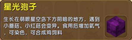 描述:生长在萌眼星空岛下方阴暗的地方,遇到小蘑菇、小红菇会变异。使用后增加氧气,可染色,可合成鸡饲料。