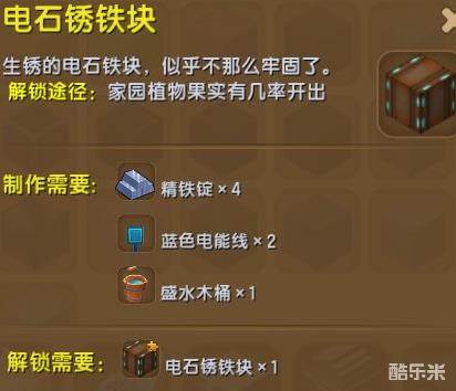 获得方法:通过制作获得,精铁锭X4、盛水木桶X1、蓝色电能线X2